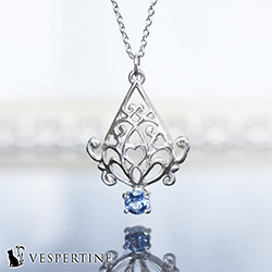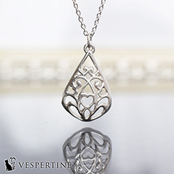 雫のシルエットに、クラシカルな透かし模様を施した「しずくネックレス」のジュエリーコレクション。輝く宝石と繊細な装飾デザインが美しいです。