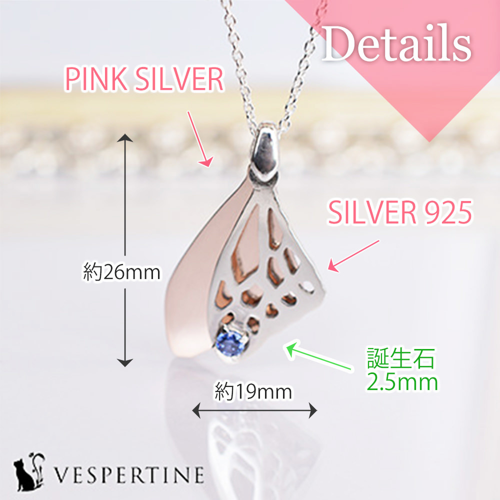 シルバーの輝きを纏(まと)った蝶の羽に、土台となるピンクシルバーのレイヤーが加わることで、シンプルなシルエットの中で美しい色彩のコントラストが生み出されています。誕生石がアクセントとなり、蝶のモチーフにささやかな彩りを添えます。