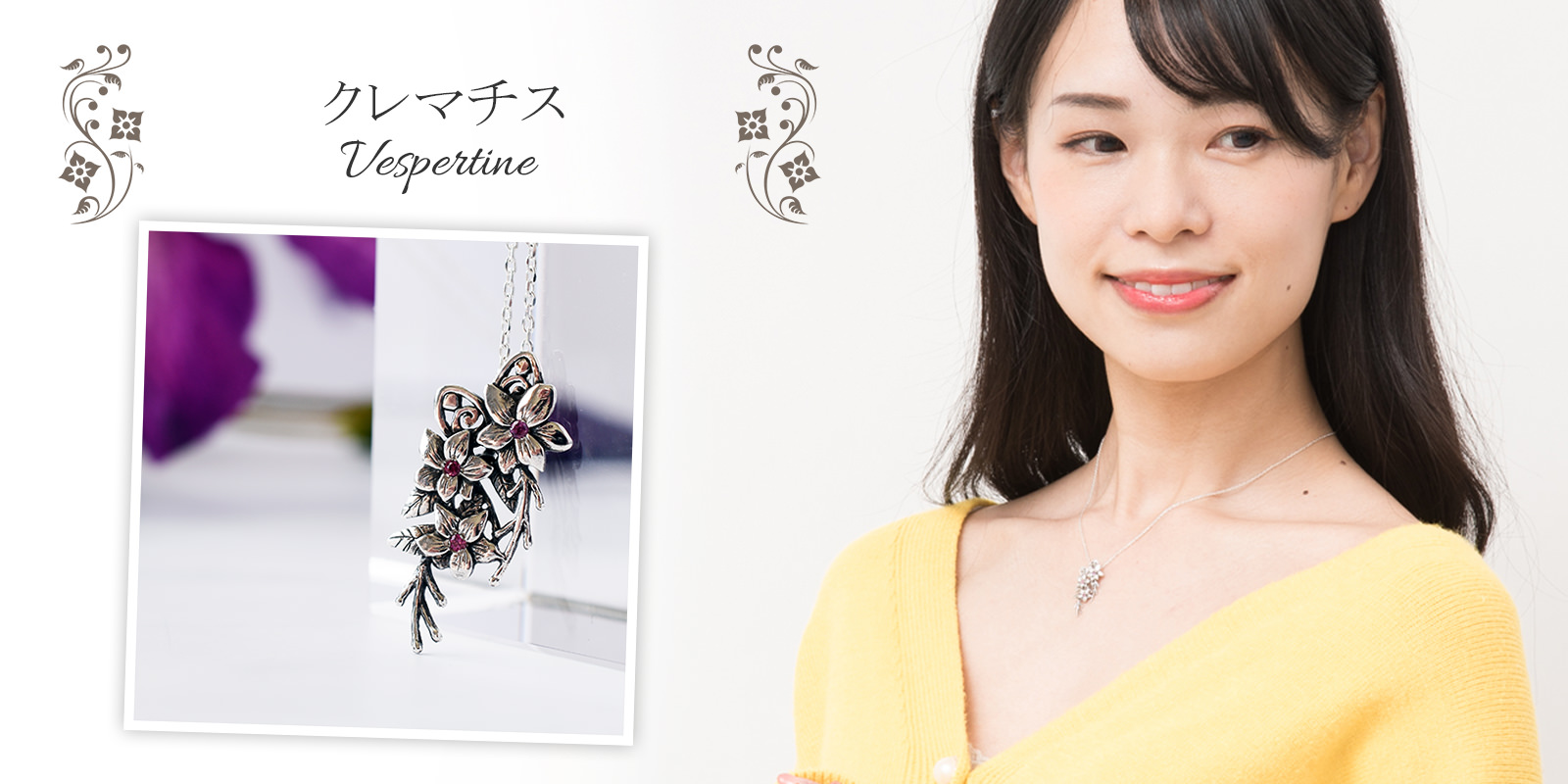 クレマチスのネックレスは、素敵な日々に華の彩りを感じさせてくれます。お花が好きな女性への誕生日プレゼントに人気です。