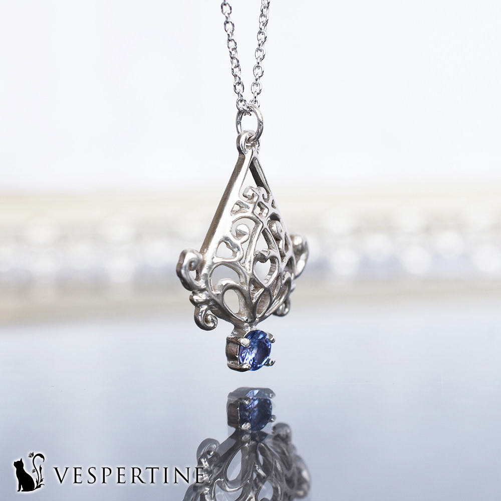 VESPERTINE(ヴェスパタイン)の透かし雫のネックレスは、普遍的なデザインにならないよう、雫のモチーフに独創性のある繊細な透かし模様を加え、命を吹き込むように一粒の天然石を留めました。