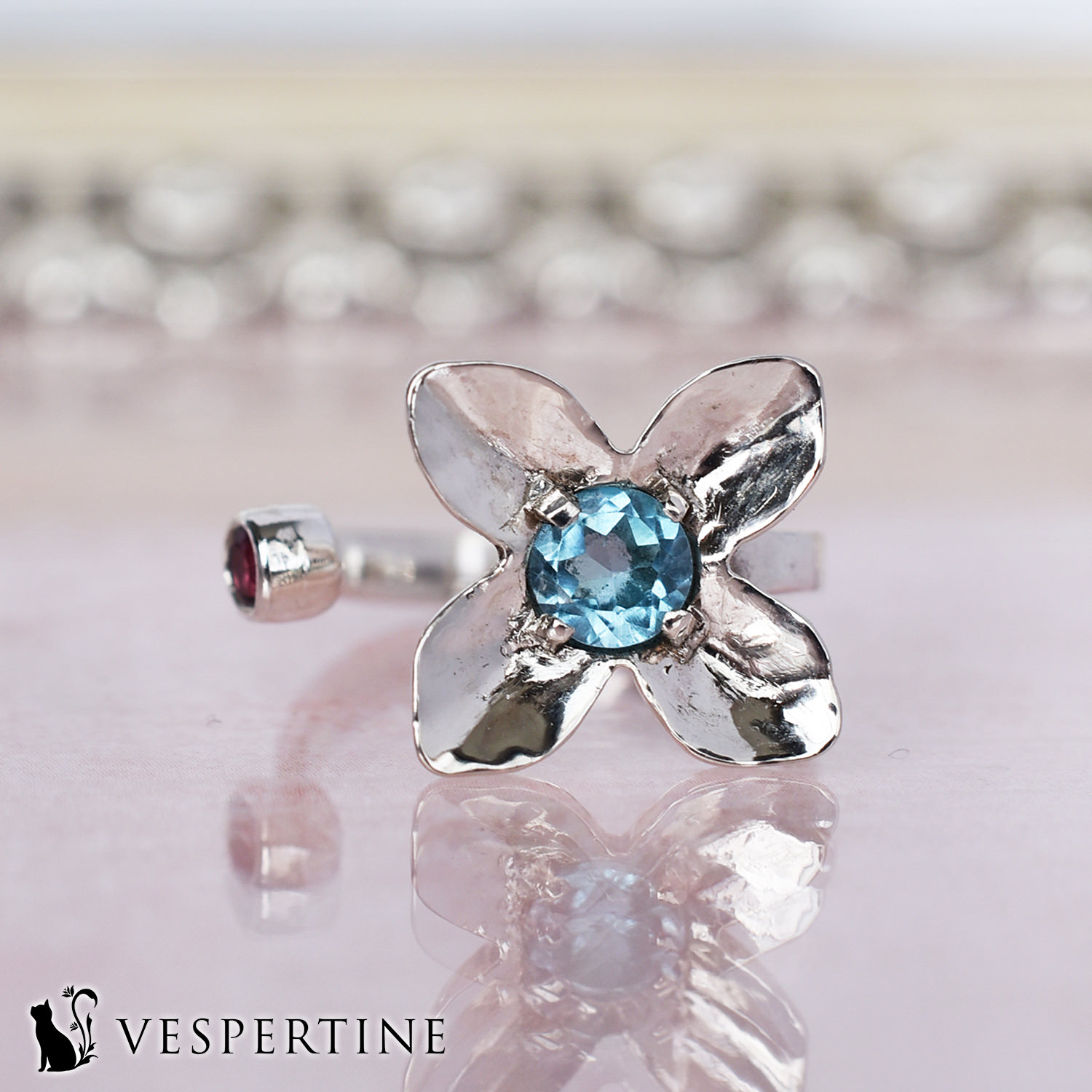 美しいスイスブルートパーズが花の中央に輝き、その鮮やかな青色は心を鷲掴みにします。