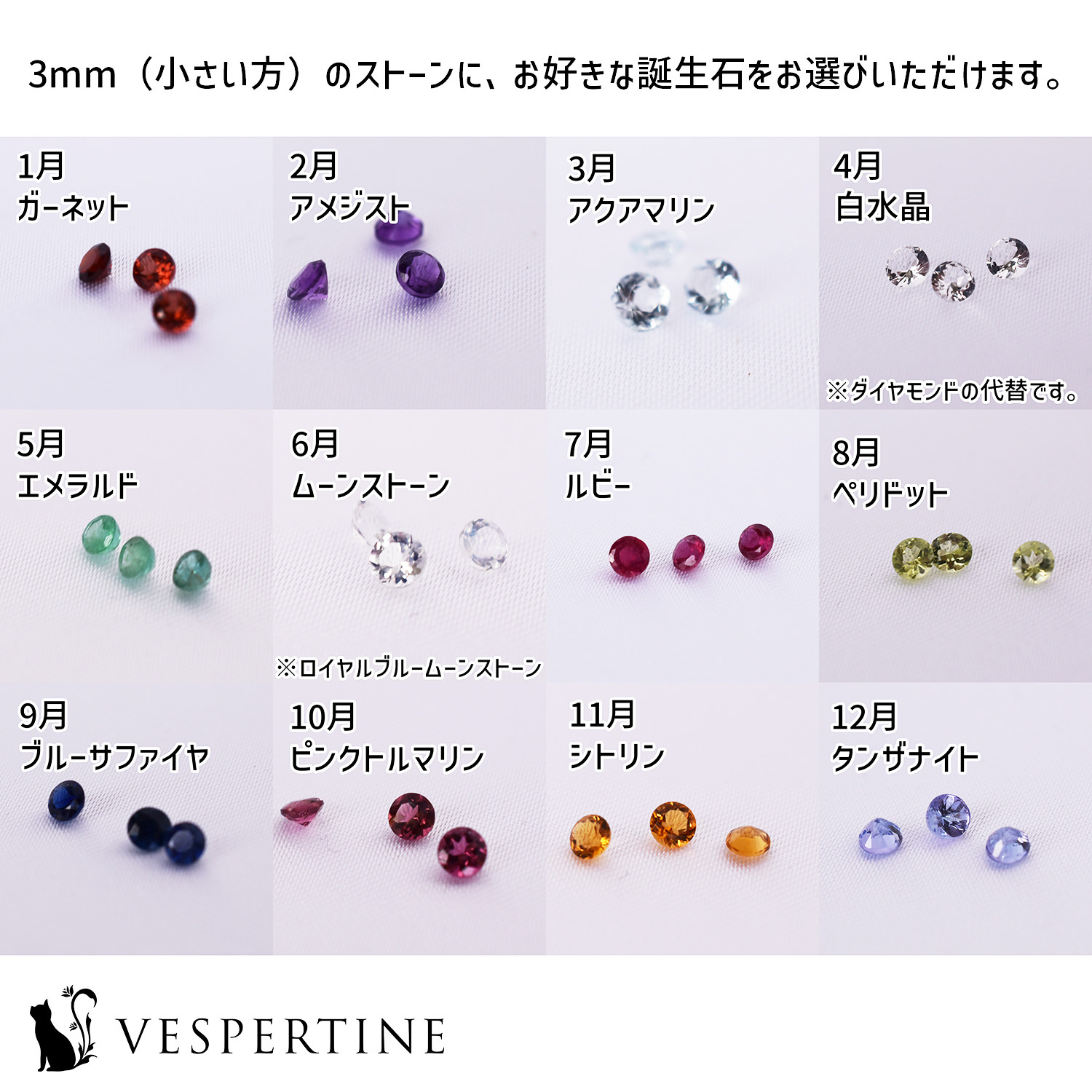 | 天然石 | ①1月:ガーネット ②2月:アメジスト ③3月:アクアマリン ④4月:白水晶(クリスタル) ⑤5月:エメラルド ⑥6月:ムーンストーン ⑦7月:ルビー ⑧8月:ペリドット ⑩9月:サファイア ⑪10月:ピンクトルマリン ⑫11月:シトリン ⑬12月:タンザナイト |
