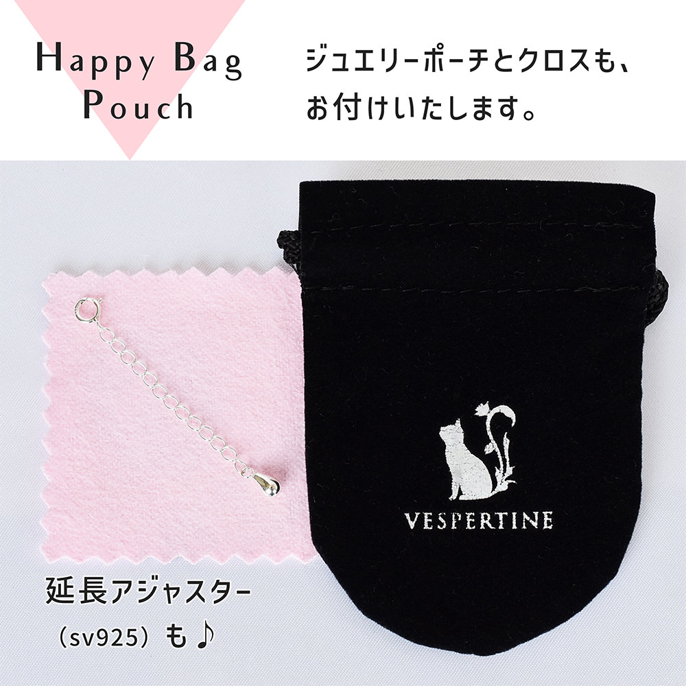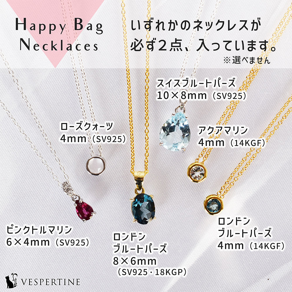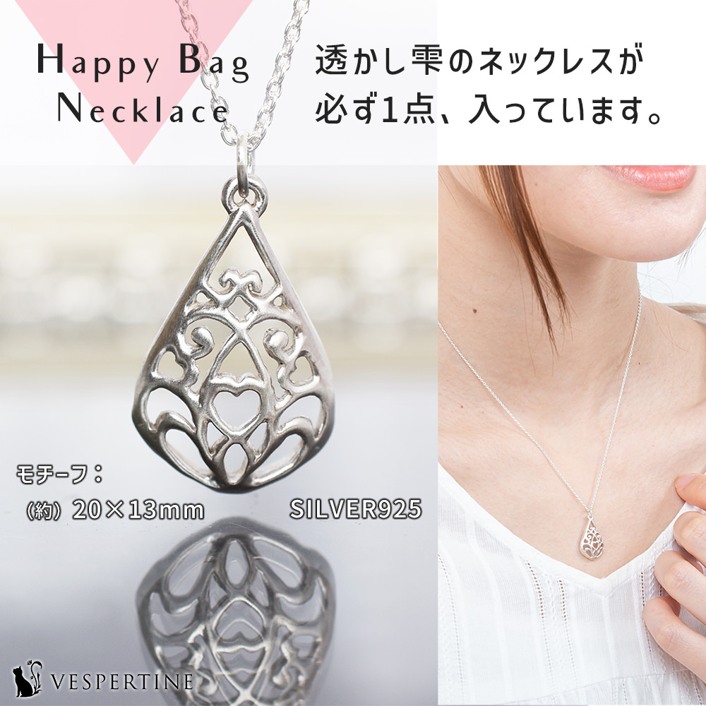 VESPERTINE(ヴェスパタイン)オリジナル「透かし雫のネックレス(石なし)」と「花とリボンのネックレス」の2点ほか、天然石のネックレスが2点、リングが3点、合計7点のアクセサリーがセットになったお得なハッピーバッグです。