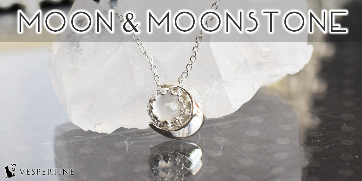 夜空から幻想的に世界を照らす月、その中心に一石の宝石のかけら、ムーンストーンが留められた月とムーンストーンのネックレス。