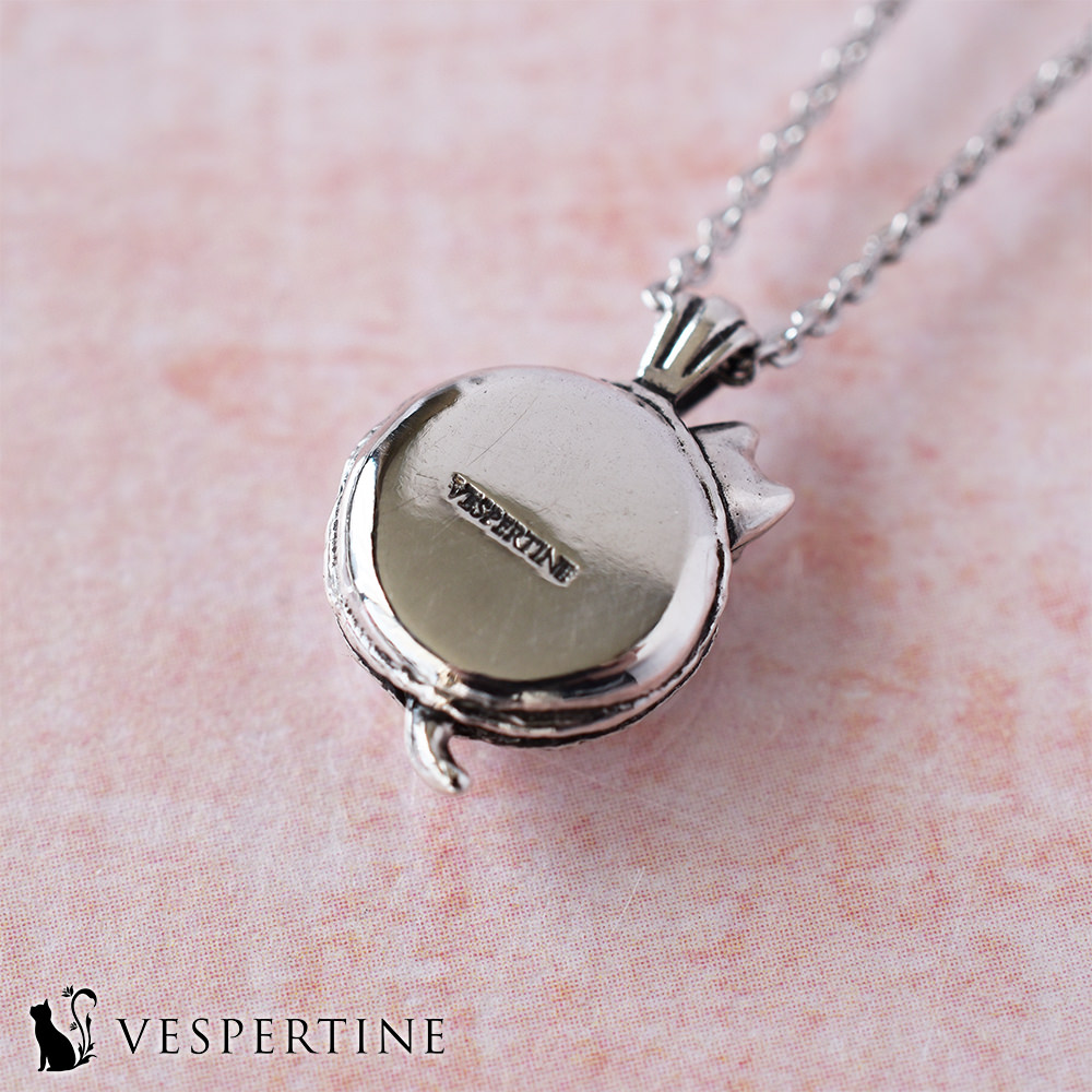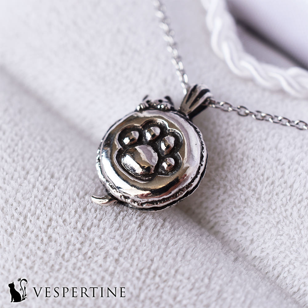 ある日、猫は魔法の輪を使って、可愛いジュエリーのネックレスを作りました。綺麗なシルバーの輝きを宿したペンダントトップには、あの不思議なマカロンの形の中に、猫の愛らしい肉球が刻まれていました。