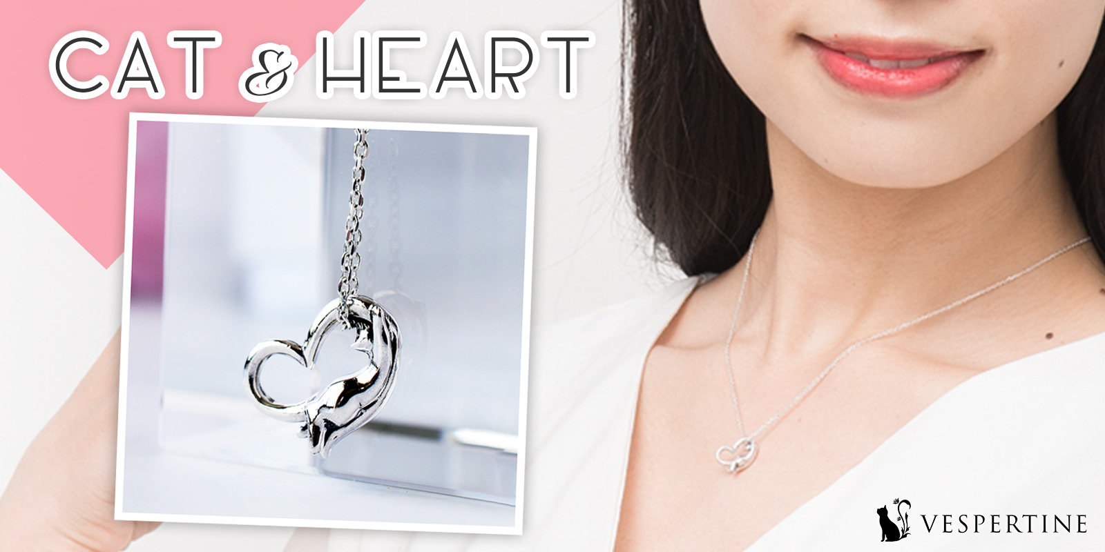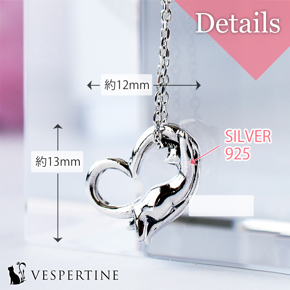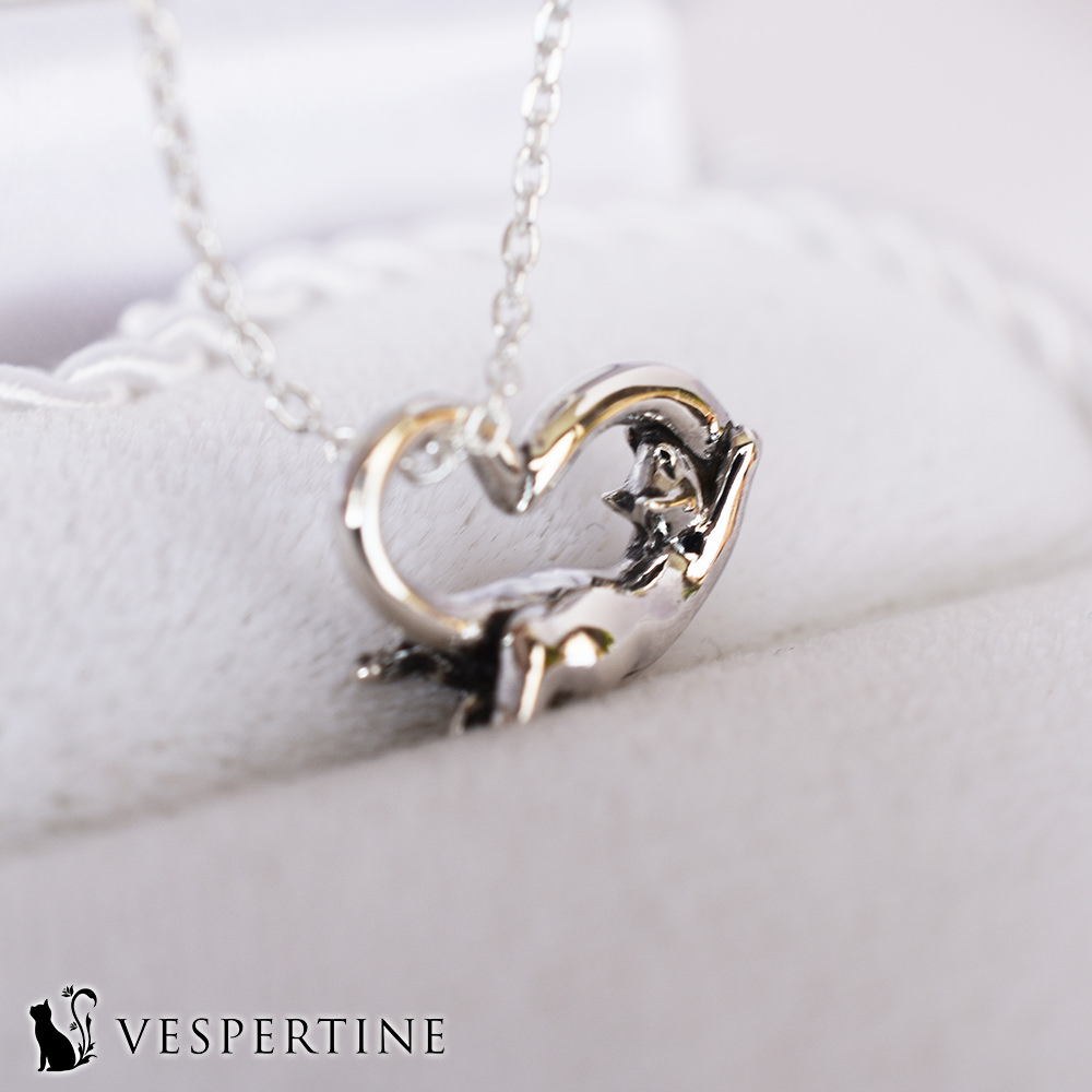 愛と絆を象徴するオープンハート、寄り添う猫のしなやかなフォルム、二つの可愛いモチーフが一つのネックレスとして美しく融合しました。