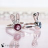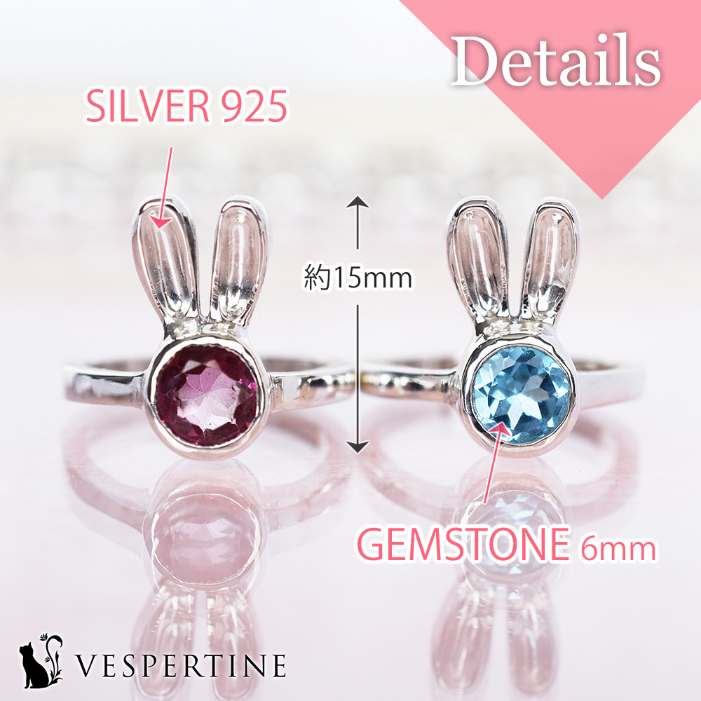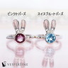 うさぎの顔のシルエットの中央には、6mmの天然石がキラキラと輝きます。鮮やかで爽やかな青い光を放つスイスブルートパーズか、可憐で女性的な輝きのピンクトパーズの2種類から、一つをお選びいただけます。