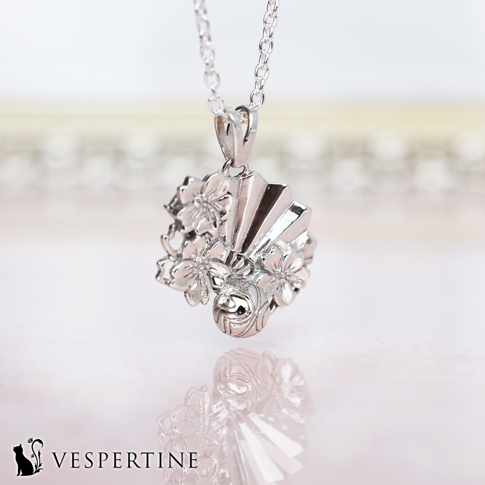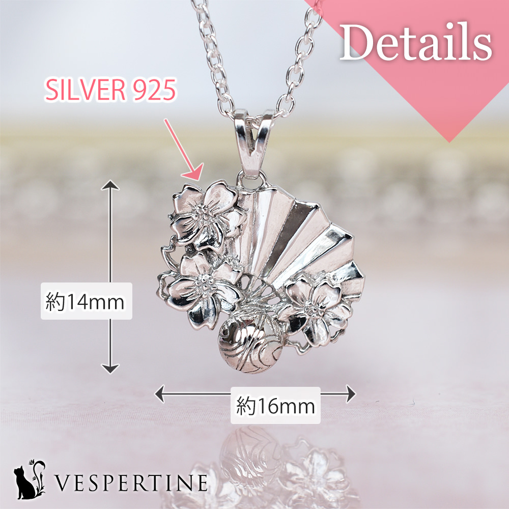 大きく広げられた扇子の端々に桜の花が散りばめられ、手毬が乗っているデザイン。日本の和と心を大切にした桜のネックレスです。