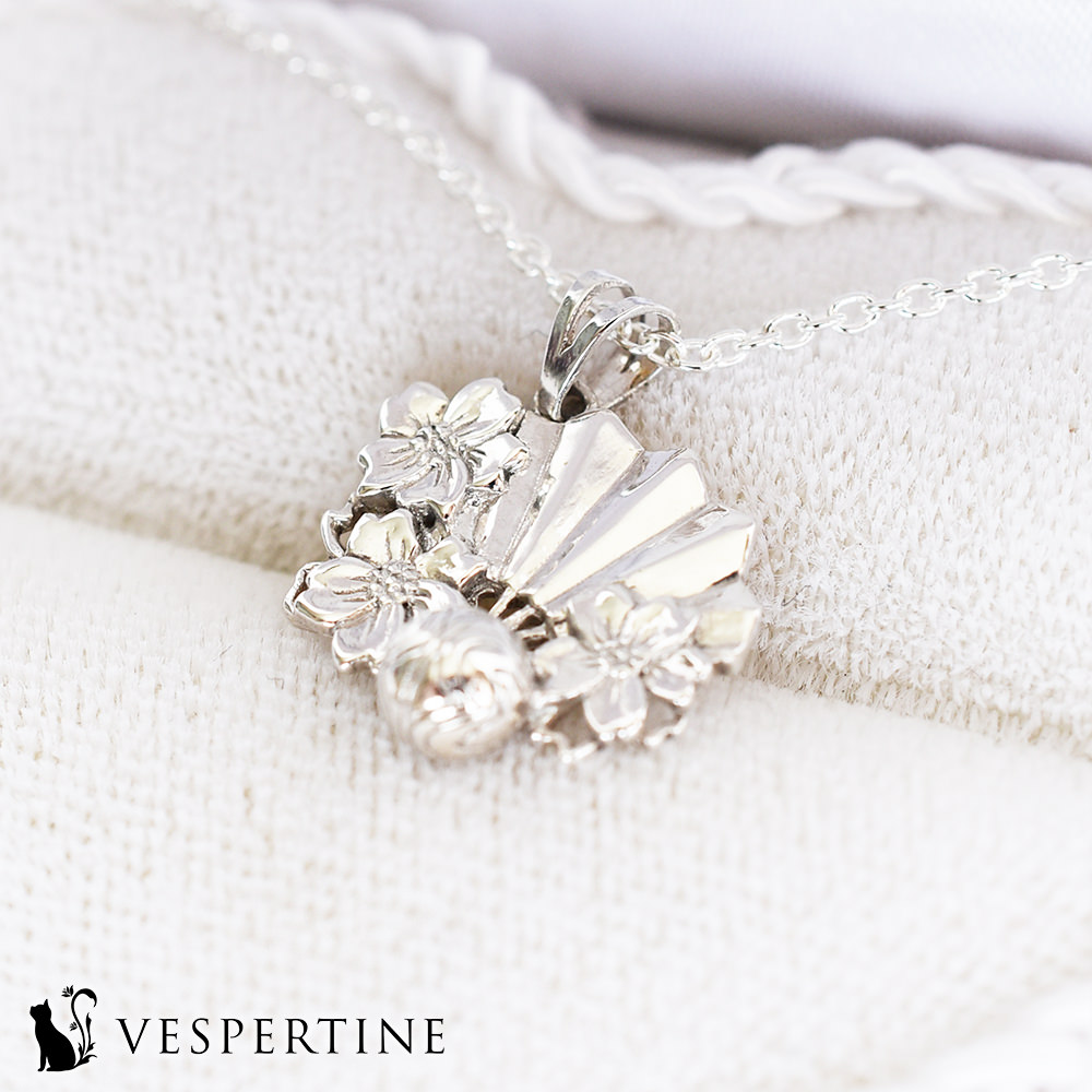 美しく愛らしい桜モチーフのネックレス。縁起物であり、和を感じさせる扇子と手毬が合わさった和やかなデザインに仕上がりました。