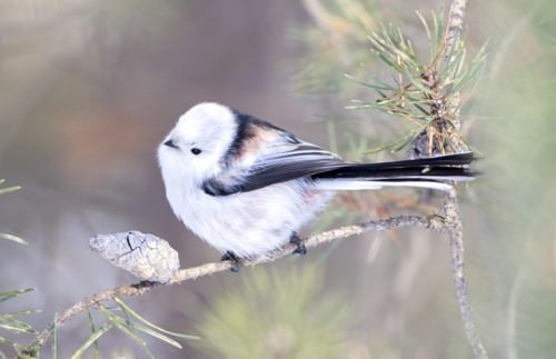 シマエナガは白くて真ん丸い体をした可愛い見た目が特徴の野鳥です。体長はわずか14cmほどしかなく、その半分は尻尾の長さです。体重も数グラムしかありません。スズメよりも小柄な体で、世界でもかなり小さい鳥に分類されます。