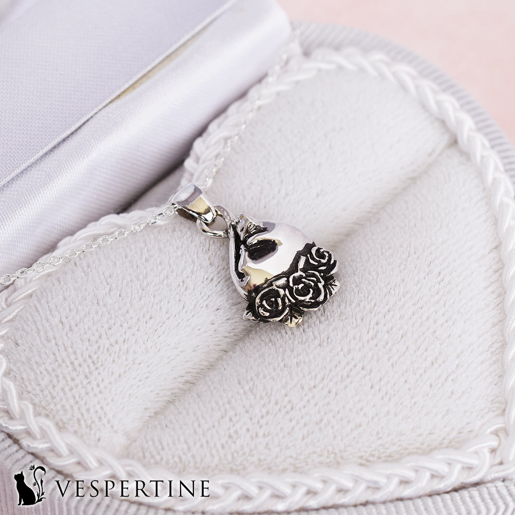 可愛い猫と美しい薔薇をモチーフにした動物と花のレディースネックレス。居眠りしているキュートな猫の傍には、華々しく咲き誇る三輪のバラ。猫好きさん、花好きさんな女性にぴったりなアクセサリー。燻し加工のシルバー925製、アンティークな雰囲気が素敵な古美仕上げです。猫好きな彼女、奥様へのプレゼントにも人気です。