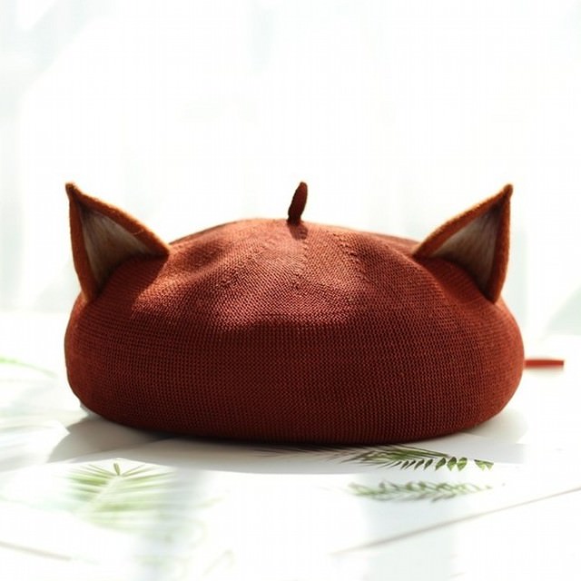 ▼きつねの耳が生えたようなベレー帽です。どんぐりの頭のような形が可愛らしいですね。こちらは手編みのハンドメイド作品です。お出かけに被って行けば、注目されそうですよね。芸術家やアーティストの方など、個性溢れるファッションに合いそうです。