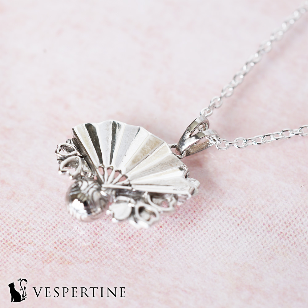桜と扇子、毬のモチーフを組み合わせたVESPERTINEのシルバーアクセサリー。和風の雰囲気が素敵なネックレス。和装や着物、浴衣など、和のファッションにおすすめです。可憐に咲いた桜の花と、大きく開いた扇子、どちらも縁起の良いモチーフですので、幸運の訪れが期待できそう。シルバー925製です。
